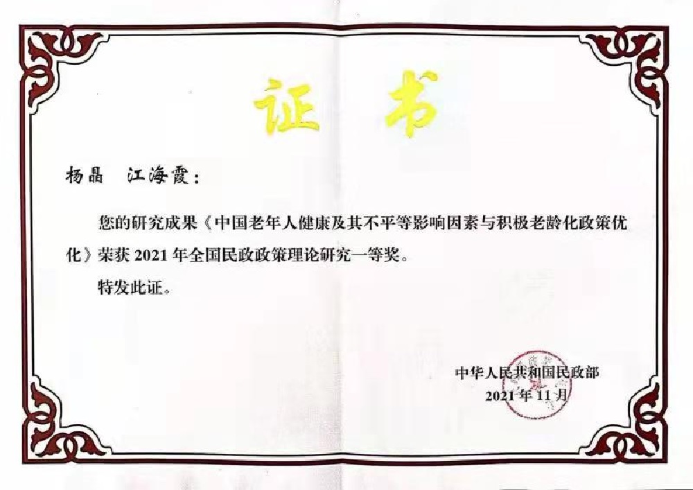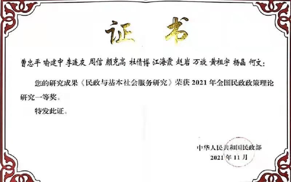 李连友教授团队与湖南省民政厅合作的研究报告《民政与基本社会服务研究》,杨晶老师和江海霞副教授申报的研究报告《中国老年人健康及其不平等影响因素与积极老龄化政策优化研究》获2021年民政政策理论研究一等奖(全国仅39项)。