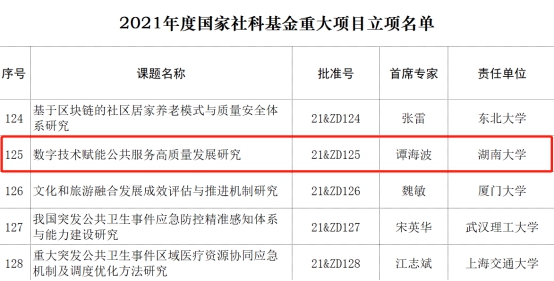 副院长谭海波教授担任首席专家领衔申报的课题《数字技术赋能公共服务高质量发展研究》(21&ZD125)荣获立项。