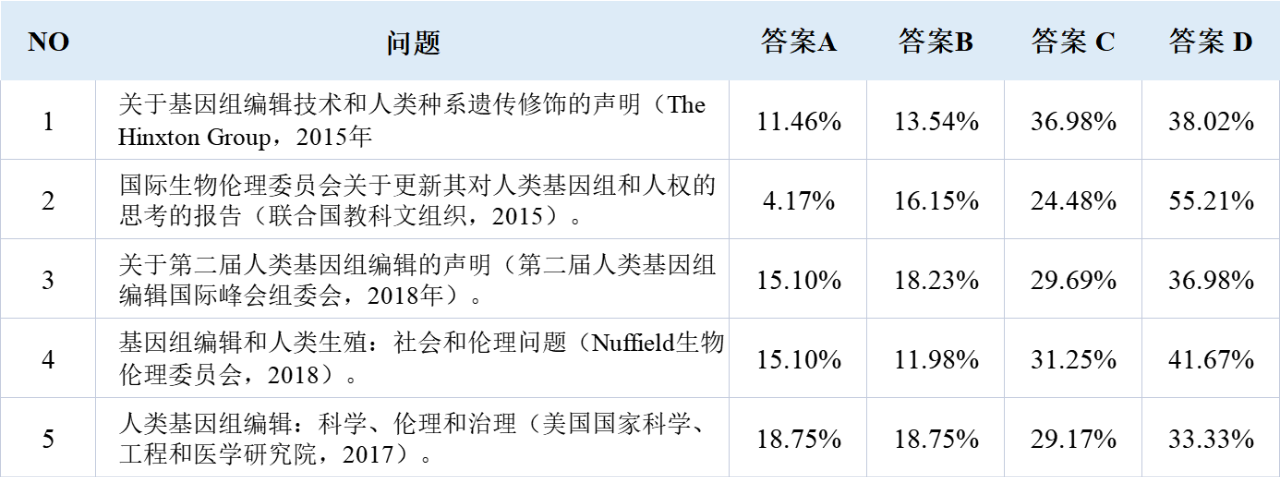 在Q1中,我们衡量了科学家对五项重要准则的了解程度,包括欣克斯顿集团(Hinxton Group)在2015年发表的《关于基因编辑技术和人类胚胎遗传修改的声明》;联合国教科文组织在2015年发表的《国际生物伦理委员会关于更新其对人类基因和人权的反思的报告》;第二届人类基因编辑国际峰会组织委员会在2018年发表的《论人类基因编辑II》;Nuffield生物伦理学委员会于2018年出版的《基因编辑与人类生殖:社会和伦理问题》;以及国家科学、工程和医学研究院于2017年出版的《人类基因编辑:科学、伦理和治理》。选择这五项准则的主要依据包括两个方面:1)它们在近期的出版物和会议中被广泛地讨论;2)它们涉及了各种类型的全球规则制定者,如政府间组织(如联合国教科文组织)、国际非政府组织(如欣克斯顿集团)、国家科学委员会(如英国纳菲尔德生物伦理委员会,美国国家科学、工程和医学研究院)和国际科学会议委员会(如第二届人类基因编辑国际峰会组织委员会)。受访者对于该问题回答的描述性统计结果如附表2中所示。
