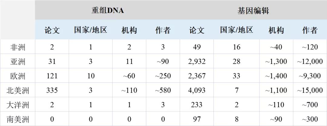 表1重组DNA(1972-1978)和基因编辑(2012-2018)的论文、国家/地区、机构和作者的全球分布情况