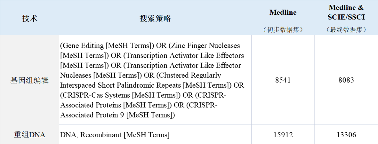 附表1 基因编辑和重组DNA相关的出版物的文献检索策略与结果