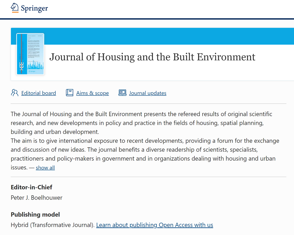 《Journal of Housing and the Built Environment》是一本涵盖住房、空间规划、建筑和城市发展等领域的专业学术期刊,向专家学者、从业者和政策制定者等广泛读者群介绍这些领域科学研究的成果以及政策和实践的新发展。该期刊发表了来自世界各地的科学家的文章,为住房、空间规划、建筑、城市发展领域的理论和实践发展提供了一个真正的国际交流平台。