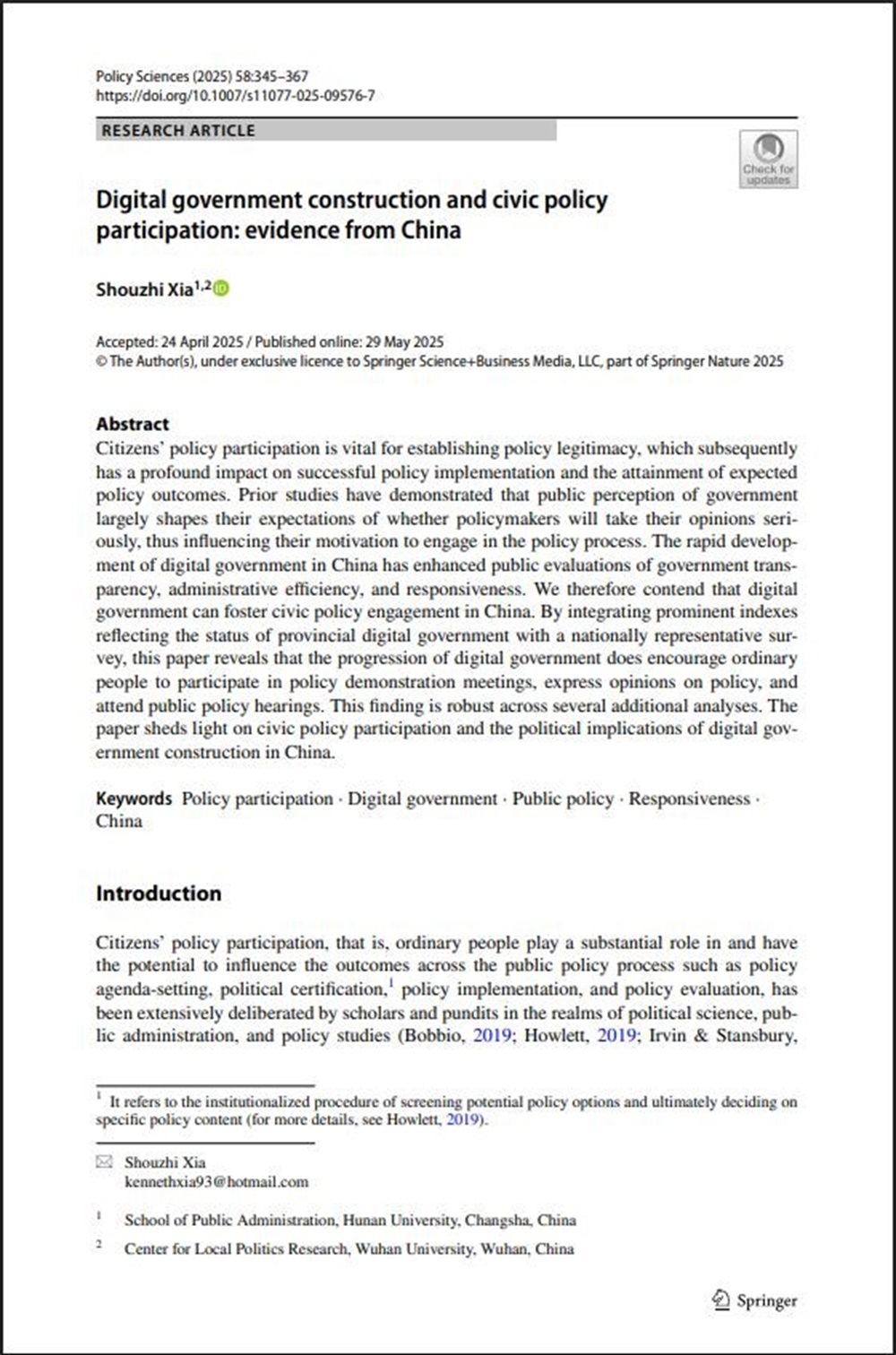 教师夏守智撰写的论文“Digital government construction and civic policy participation: evidence from China”(《数字政府建设与公众政策参与:来自中国的证据》)在公共政策领域国际权威期刊Policy Sciences 2025年第2期发表。Policy Sciences创刊于1970年,聚焦政策分析与公共治理的交叉融合,致力于系统性探讨政策过程、决策机制、政策工具及其对经济社会发展的影响。期刊2024年影响因子为3.7,五年影响因子为4.4。