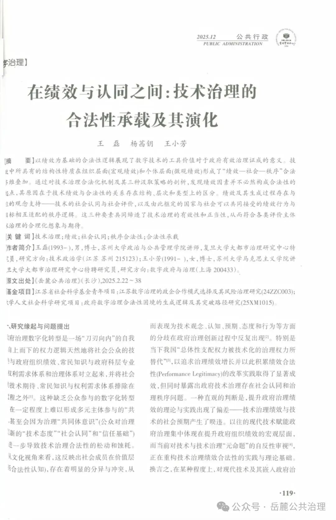 《岳麓公共治理》2025年第2期文章《在绩效与认同之间:技术治理的合法性承载及其演化》(作者:王磊,杨茜钥,王小芳),被《人大复印报刊资料 · 公共行政》2025年第12期全文转载。