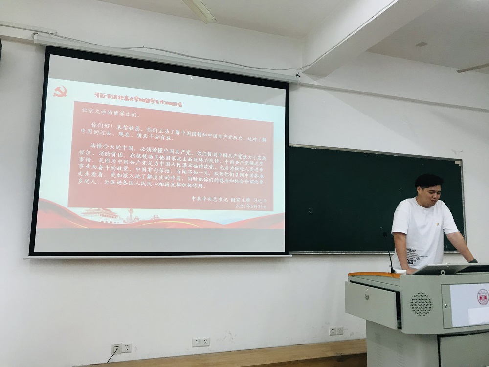 深入学习和理解习近平总书记给北京大学留学生的回信精神,对于我们搞好党史学习教育具有重要的指导意义。习近平总书记在回信中指出,“读懂今天的中国,必须读懂中国共产党”。对于外国留学生而言,要了解真实的中国,必须要深入了解中国共产党的百年奋斗史,必须要认识到“中国共产党是中国特色社会主义事业的领导核心”,必须深刻认识中国共产党“全心全意为人民服务”的宗旨。