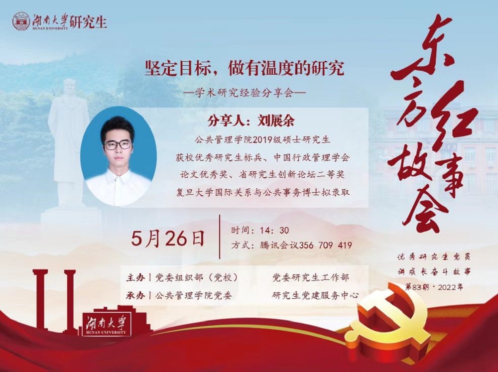 刘展余在校期间曾获硕士研究生国家奖学金、校优秀研究生标兵、湖南省研究生创新论坛二等奖、中国行政管理学会年会优秀论文奖等荣誉奖项,毕业后将于复旦大学国际关系与公共事务学院攻读博士学位。
