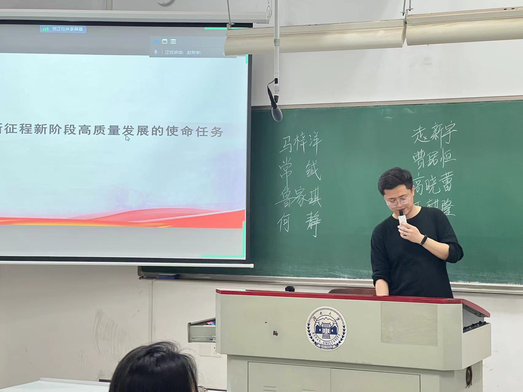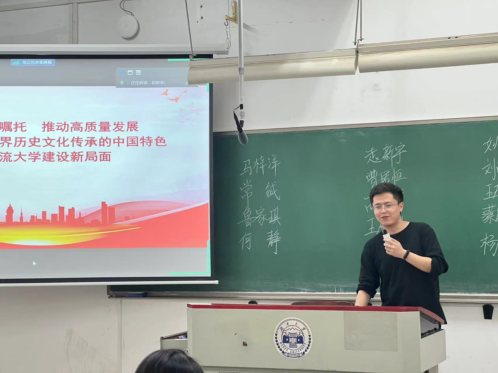 本科生第一党支部于综合楼516教室开展了关于学习贯彻学校第十次党代会精神的主题党日活动,本次活动主题为“牢记总书记嘱托,推动高质量发展,奋力开拓富有世界历史文化传承的中国特色世界一流大学建设新局面”。本科生第一党支部书记赵新宇主持会议,支部全体成员参加学习。