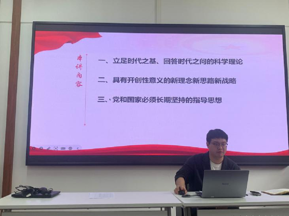 课堂伊始,胡春晖老师带领同学们重温了习近平总书记提出的“学思想、强党性、重实践、建新功”总要求。曹珺恒同学讲解了习近平新时代中国特色社会主义思想的核心内容。