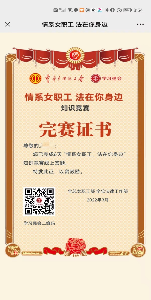 “情系女职工,法在你身边”参赛截图及完赛证书