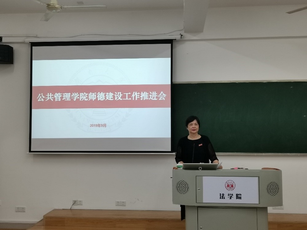 师德建设工作推进会,学院全体教职工参加会议,学院党委书记付蓉芬主持会议并发表讲话。