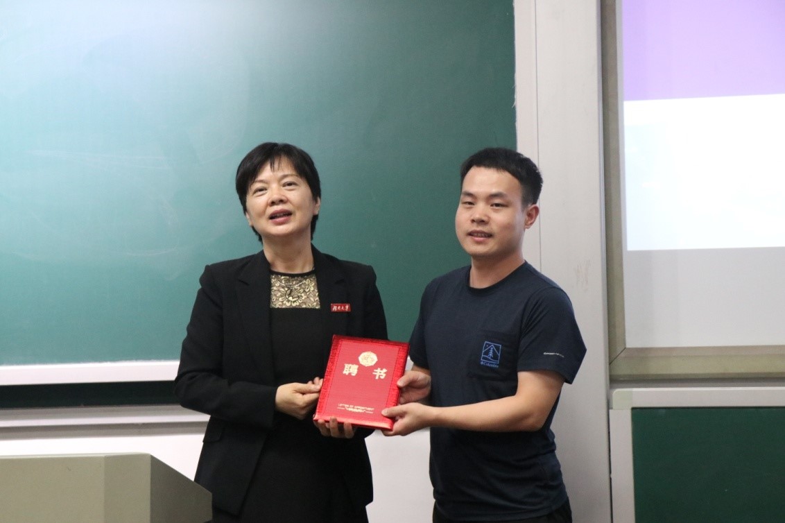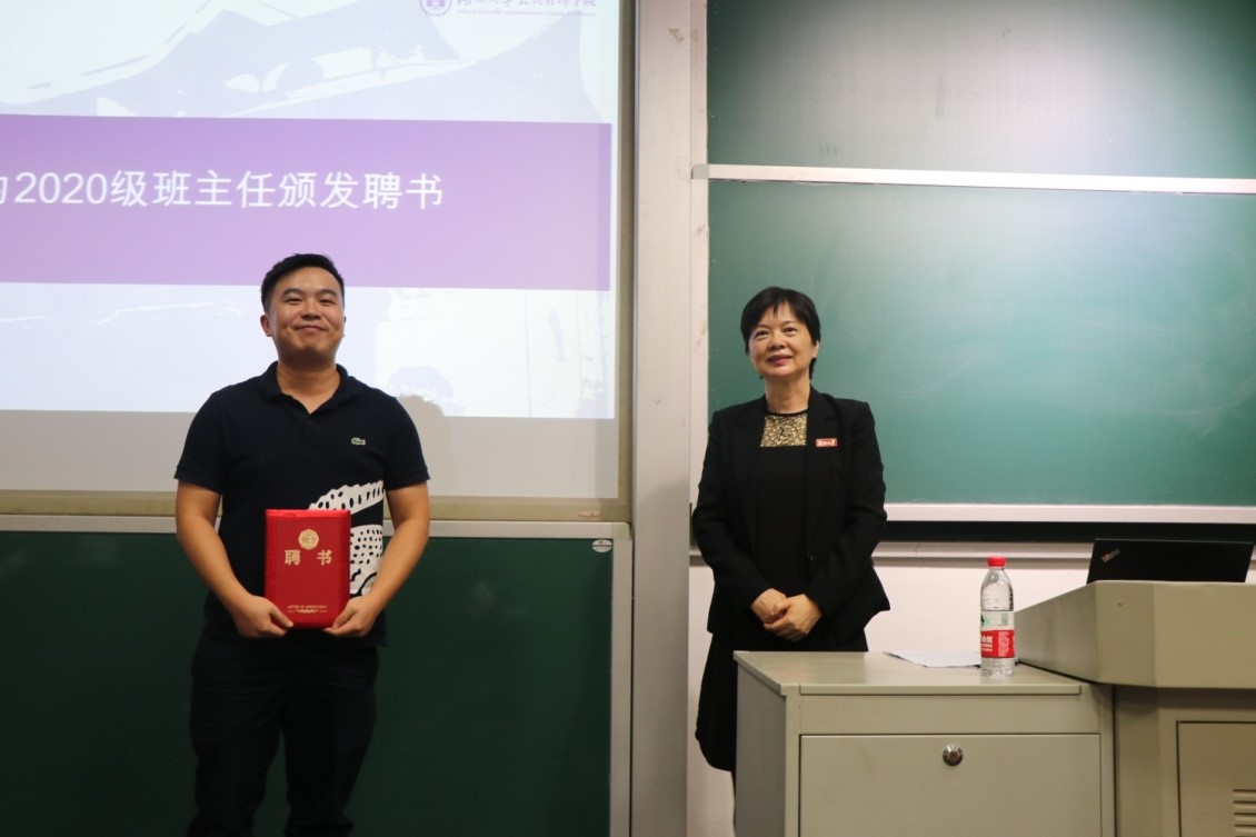 党委书记付蓉芬老师为新生班主任黄祖宇老师、万旋老师颁发了班主任聘书。付蓉芬书记向新生介绍,两位老师分别毕业于墨尔本大学、香港中文大学,学术功底扎实、积极进取、热爱学生,能够为学生成长提供有益帮助。她希望同学们积极向这两位老师学习请教,在学习、生活等方面主动与两位老师联系,服从两位老师的安排,把握好大学四年的学习与生活。