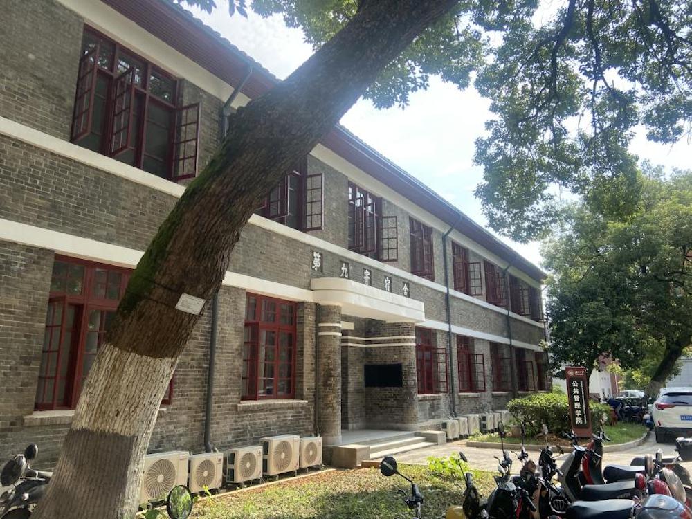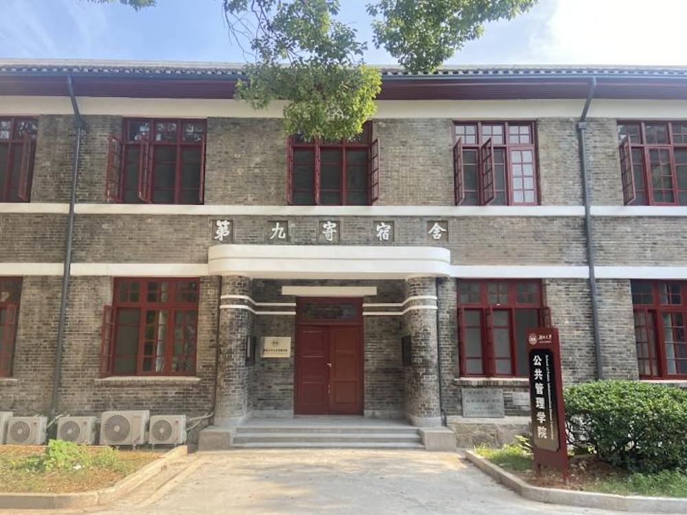 校舍遭到日本侵略者的轰炸、焚烧,损失惨重,柳士英带领一帮师生自力更生,设计建造了一批宿舍,其中就包括第九学生寄宿舍。该建筑紧邻岳麓山脚,南边是一处空坪与绿化地面,周边绿化以大型樟树、散尾葵、冬青、丛植金叶女贞为主,环境幽静、风景宜人,是读书治学的好地方。2013年,被国务院批准为第七批全国重点文物保护单位。