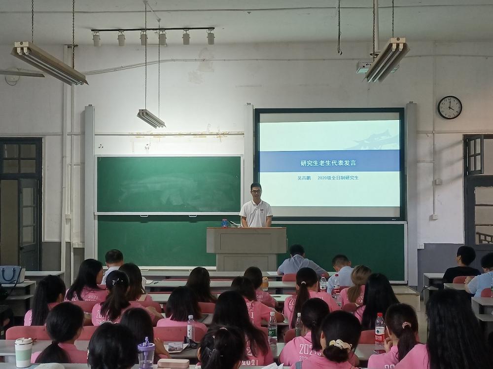 2020级全日制研究生吴高鹏代表全体研究生老生向师弟师妹们分享学习和生活上的经验,鼓励新生们利用资源主动学习,练就过硬的专业本领,扎实学好每一门课程,积极应对学习和生活中的挑战,提高承压能力。