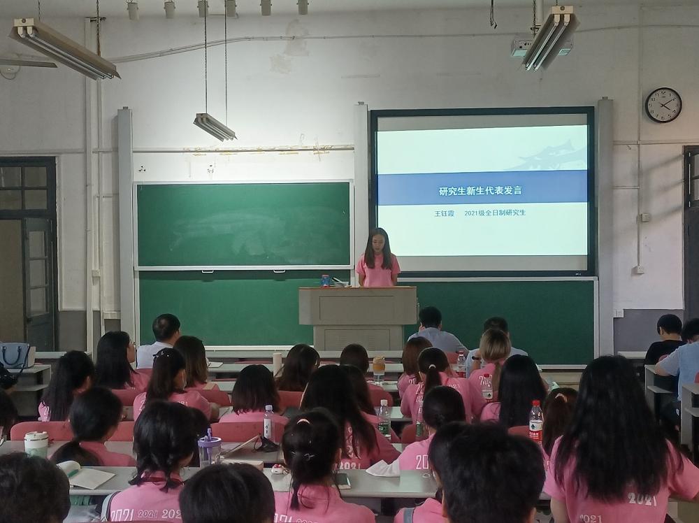 2021级全日制研究生王钰霞代表2021级研究生新生进行发言,以学院人才培养目标为切入点,从研究生角度分析了自己的目标和方向:研究生当以学术研究为先,独立思考,认真学习,要在做好学术交流的前提下,洞察民生担当公共责任,实现自我价值。