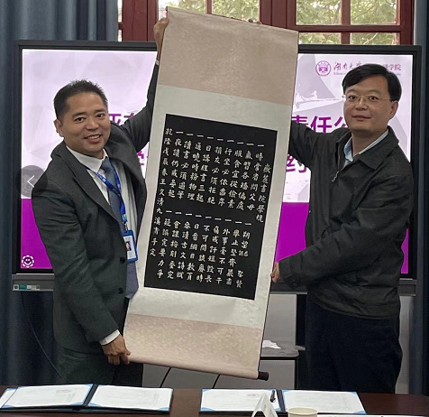 党委副书记杜倩博代表学院向考德上教育集团赠送了一幅《岳麓书院·学规》拓片,考德上教育董事长田亚东收下了这份有着特殊意义的珍贵礼物。