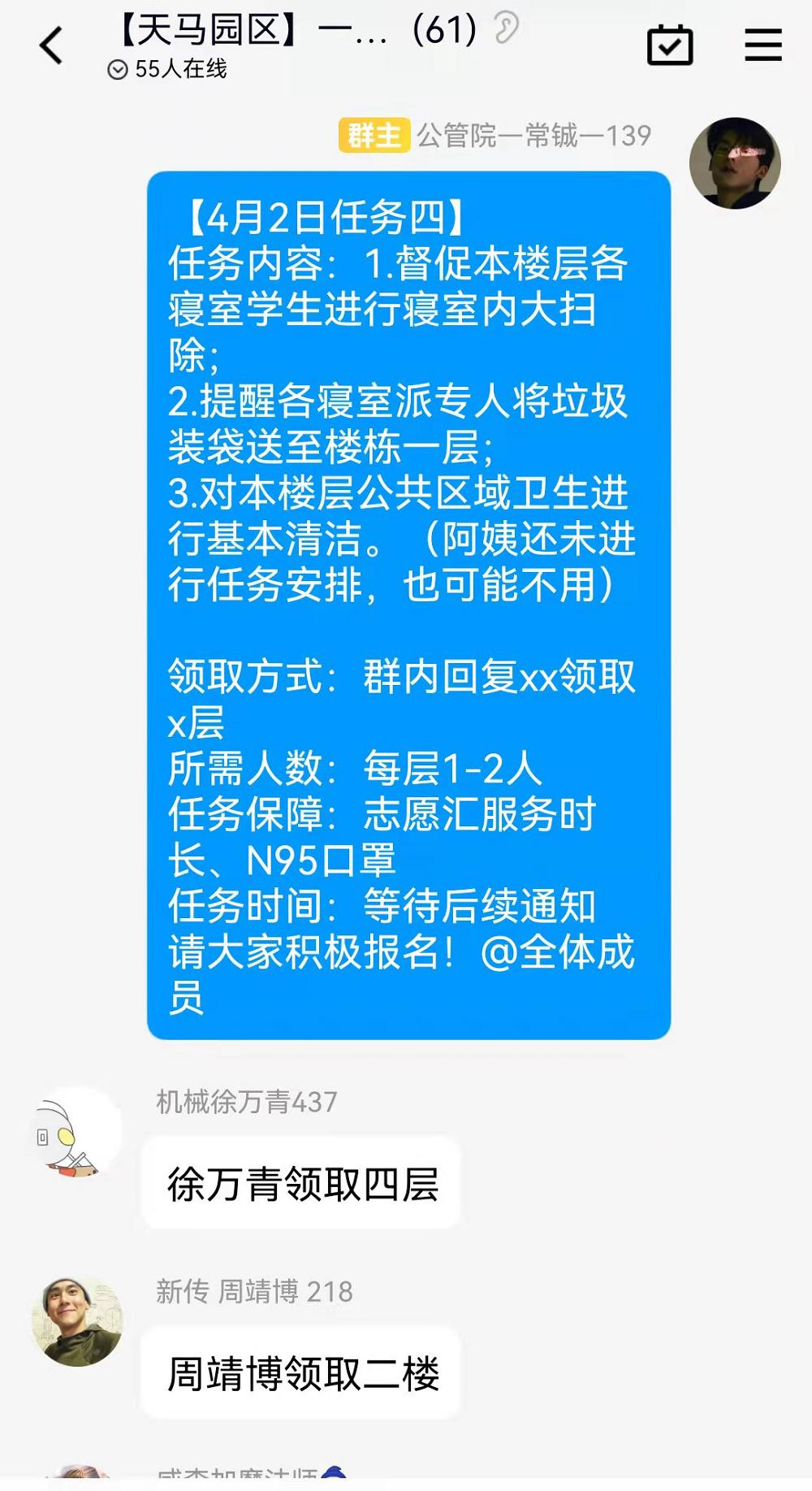 苏秋蓉、范思怡、常铖、李宏圳、曲文英、翁嘉怡六位同学主动担任了楼栋层长这一职务。在封校期间,他们不仅要协助组织开展每日核酸检测提醒与统计工作,监督本层同学的核酸进度,还负责红黄码寝室用餐、物资需求等方面的统计,组织安排志愿者为这些寝室的同学们开展生活服务,保障他们的生活。除此之外,他们还需将团委发放的防疫物资送到每一个寝室,包括给红码寝室分发自测盒等检测用品等。这些同学身为楼栋层长,时时刻刻注意着手机的消息,将楼栋辅导员老师提供的信息传达到每一个寝室、每一位同学,并不厌其烦地回答每一个问题,积极回应大家在生活、医疗等方面的需求。