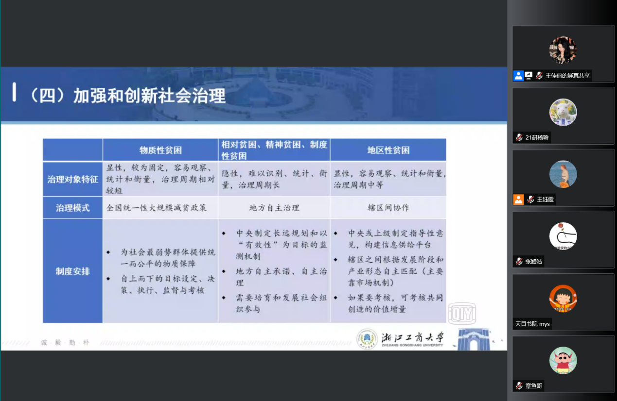 郁建兴老师的精彩分享引发参会师生热烈讨论,杨钦喆、胡玲、于均环等同学和杨晶老师分别就“‘共同富裕示范区’和‘重要窗口’二者间的关系”、“社会治理和共同富裕二者间的关系”、“公共服务领域的共同参与如何助力于共同富裕”、“设计共同富裕战略和政策框架应该全国整体划一推进的,还是渐进式、分层次、梯度推进”等若干问题进行了提问,郁建兴老师一一予以耐心细致的解答。