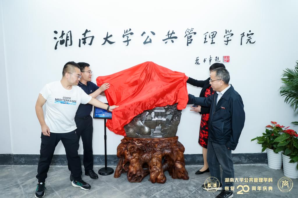 在学院门厅夏书章先生题字前,付蓉芬书记、李金龙教授与2004级研究生校友代表刘明然、2001级本科生校友代表张俊峰共同为“岳阳楼记”菊花石揭彩。刘明然表示,“岳阳楼记”菊花石雕刻蕴含的忧国忧民情怀与无码动画