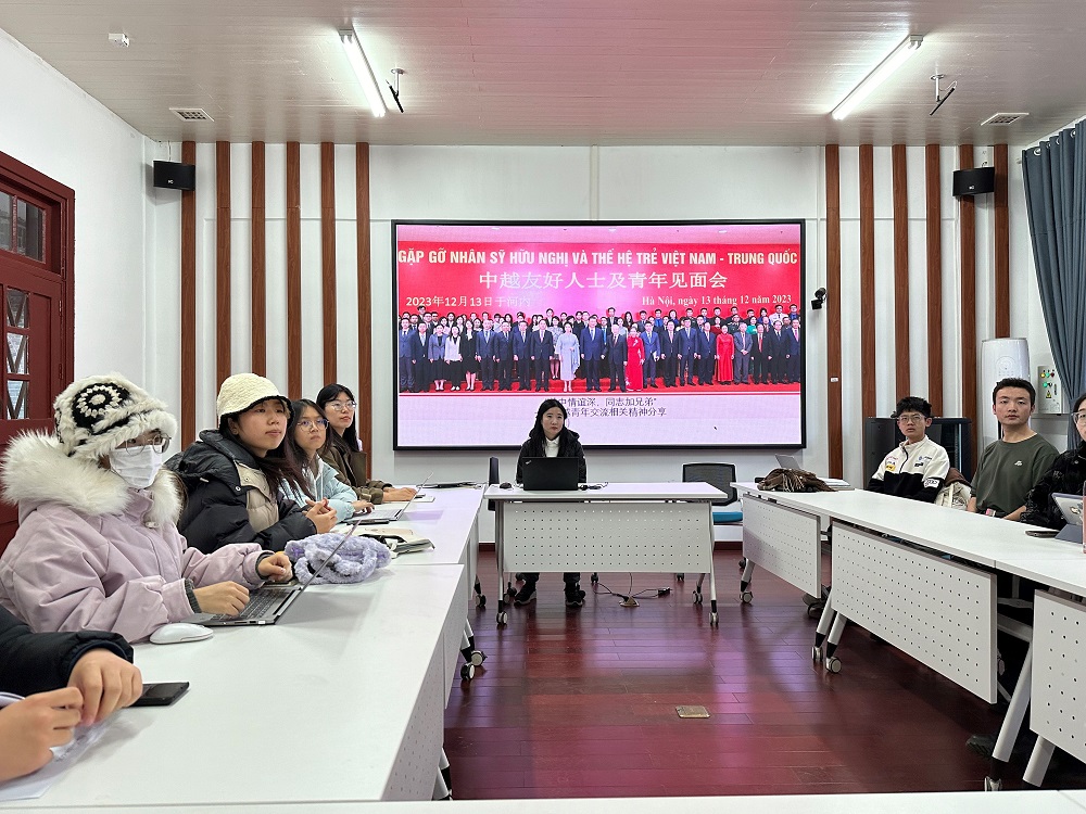 何韵老师重温、传达了习近平总书记的讲话精神:赓续传统友谊,开创中越命运共同体建设新征程--会见中越两国青年和友好人士代表时的讲话。回顾历史,中越两党和两国坚守共同理想信念,守望相助;立足当下,中国长期是越南的最大贸易伙伴,越南是中国的全球第四大贸易伙伴,合作共赢是时代所需;展望未来,坚持与邻为善、以邻为伴,让中国式现代化更多惠及周边国家。并强调习总书记对中越青年的殷切希望,期待新时代青年可以担起时代重任,做中越友谊的传承者,做亚太振兴的参与者,做人类进步的开拓者。