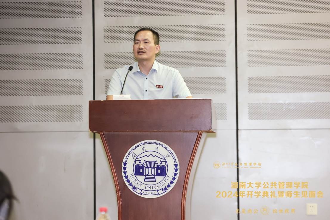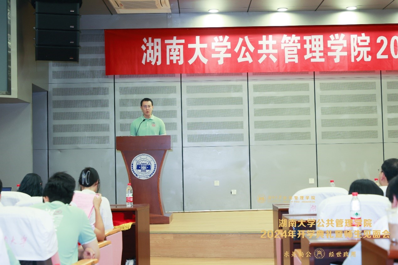 行政管理专业2001级本科生许朋江作为校友代表致辞。他回忆了自己在湖大的求学之路,真切表达了对在学校度过的时光的怀念与感谢。并以自己的经历出发,从学业探索、社交情谊、个人成长、自我挑战四个方面讲述了自己若能重回大学想要做的事,借此激励新生在大学努力学好专业知识,做新时代的公共管理人才。