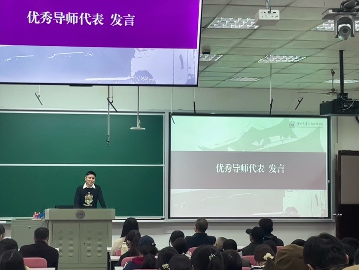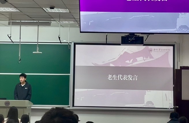 接着,老生代表伊国鑫分享了自己在导师制下的成长与收获:在李金龙教授的指导下,他不仅取得了学业进步,更收获了个人成长。最后他寄语学弟学妹们要珍惜与导师的相处机会,积极进取,收获不一样的大学生活。