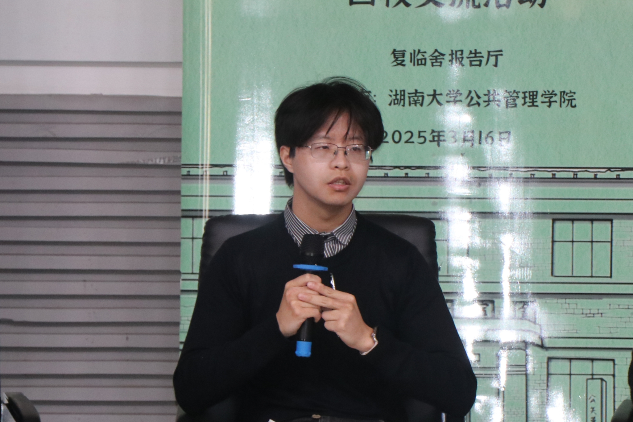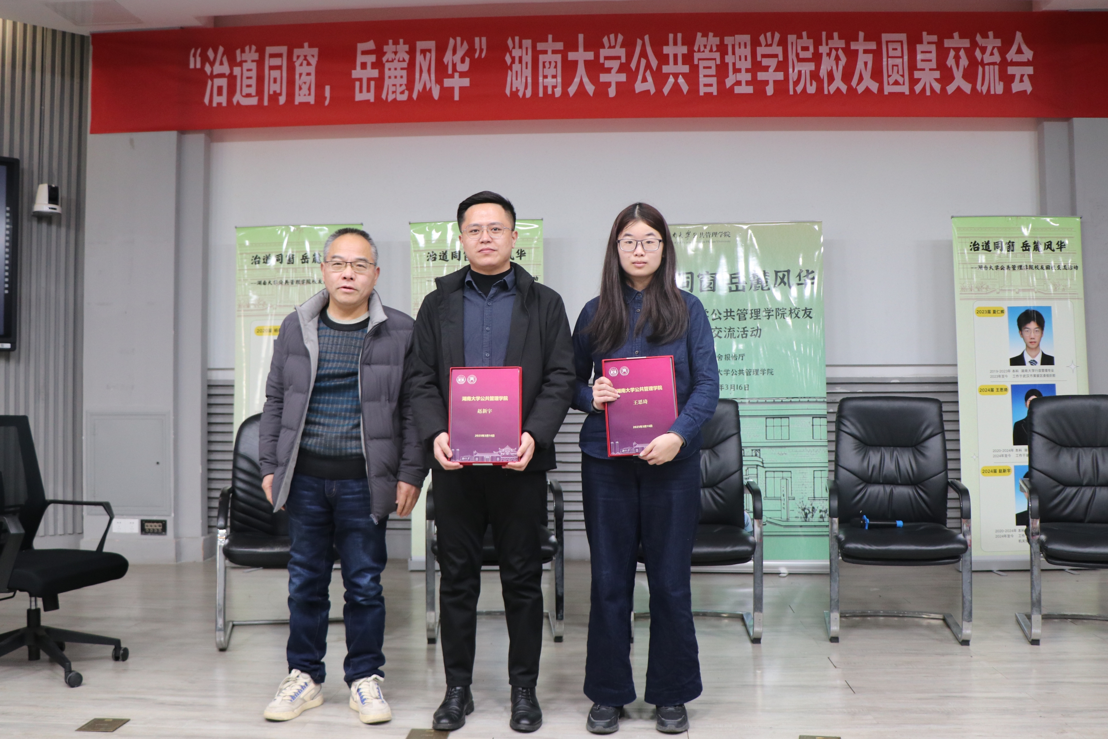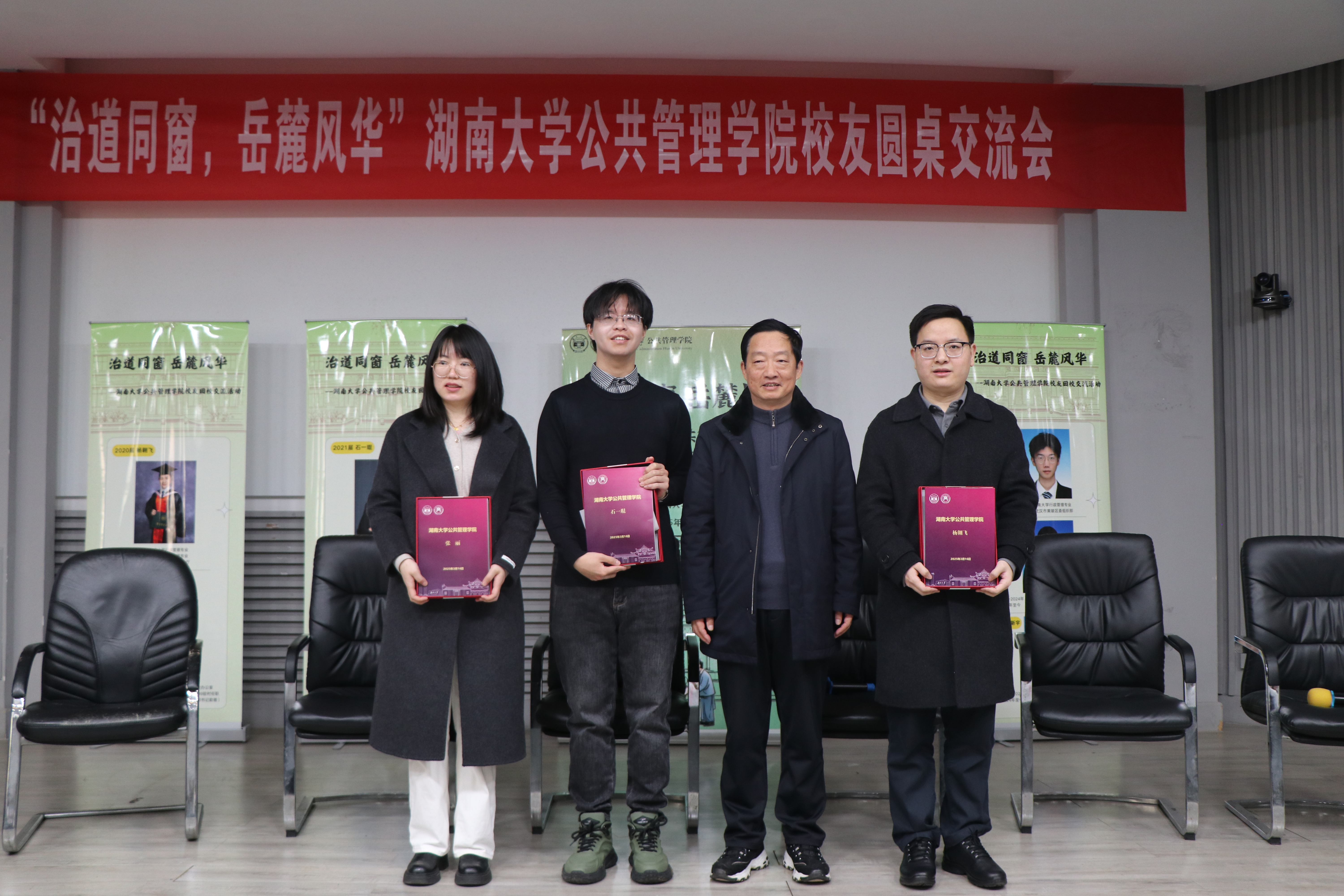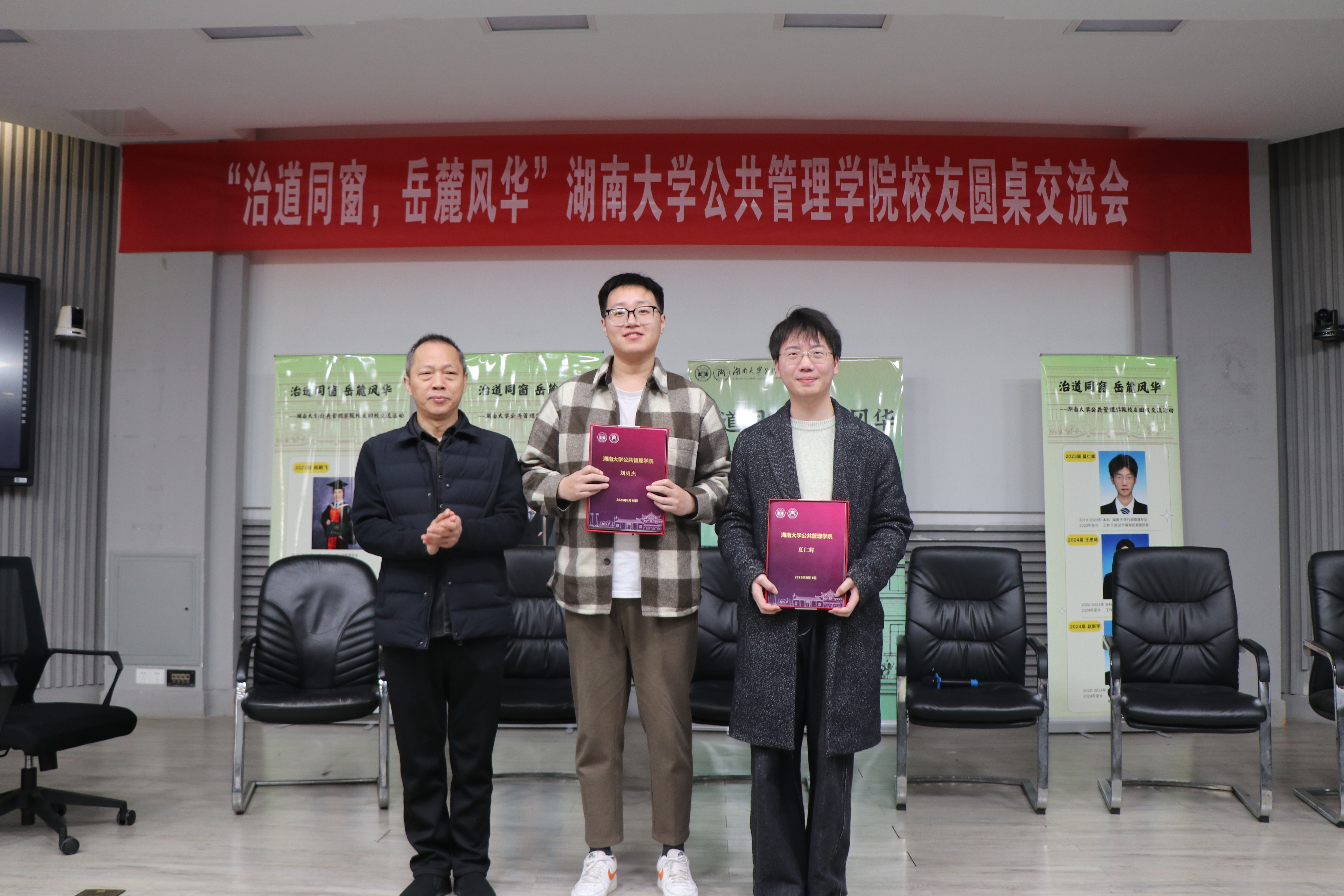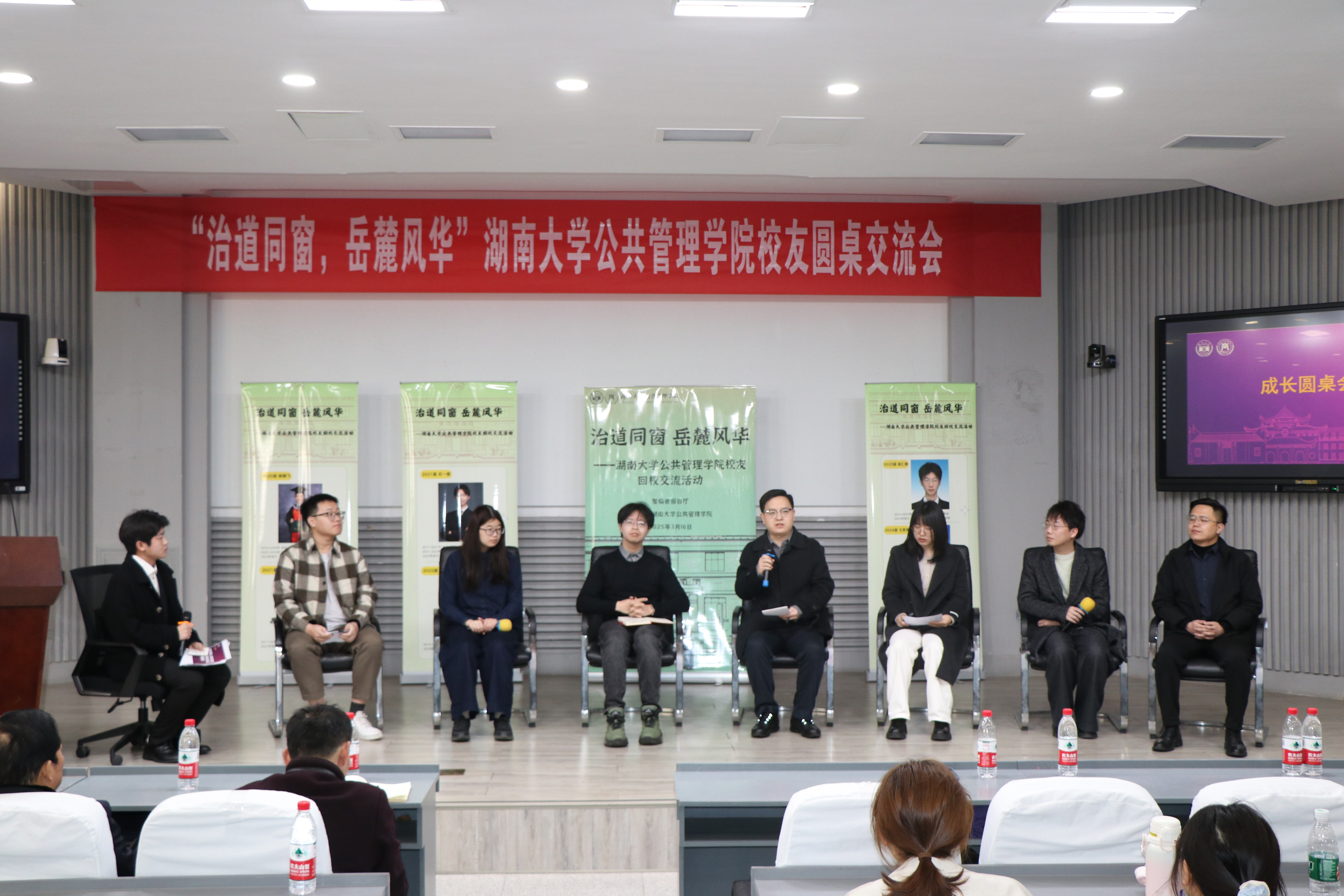 杨翱飞、赵新宇结合在政府机关的工作实践,认为“求是尚公,经世致用”很好地诠释了公共管理专业的使命,要立足中国治理场景,以岳麓之智创造公共价值。刘勇杰、石一琨谈到自己在湖大读书的经历,建议同学们充分利用学校资源,建立多学科视野,关注人工智能发展。张丽、夏仁辉、王思琦结合工作实践,强调要注重实践导向的能力培养,如解读政策的能力、构建知识地图的能力和独立分析问题的能力等。