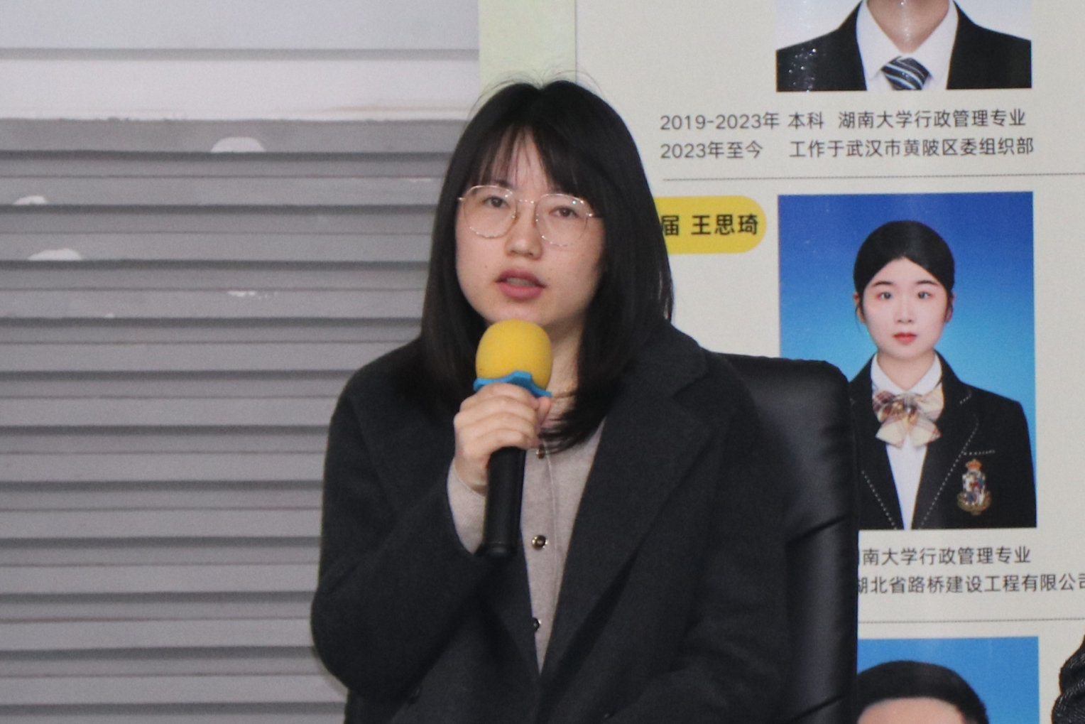 交流会伊始,杜倩博向在场师生介绍7位优秀校友,他们当中有人在政府机关、国有企业和基层发光发热,也有人正在清华复旦等名校继续深造。今天重聚岳麓山下,以“过来人”的身份给师弟师妹们分享成长经验。