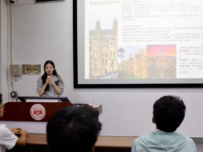 的三位优秀学生代表依次上台,分享了海外交流生活的感悟 —— 行政管理 2201 班的乔冠伦曾赴加州大学伯克利分校(UCB)交流,城市管理 2201 班的许伊岚曾赴牛津大学交流,行政管理 2301 班的张雅涵曾赴剑桥大学交流。三位同学围绕学业生活、异国体验、语言学习三大维度展开分享,内容真实生动、富有感染力,为在场同学提供了极具参考价值的海外交流经验。