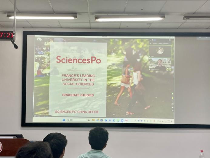 谷浩老师现场分享,巴黎政治学院驻华办公室韩贺老师通过线上连线形式参与互动,赴英美海外名校交流的优秀学生代表亦到场分享亲身经历。院内外同学踊跃参与。宣讲会由学院宋杰书记主持。