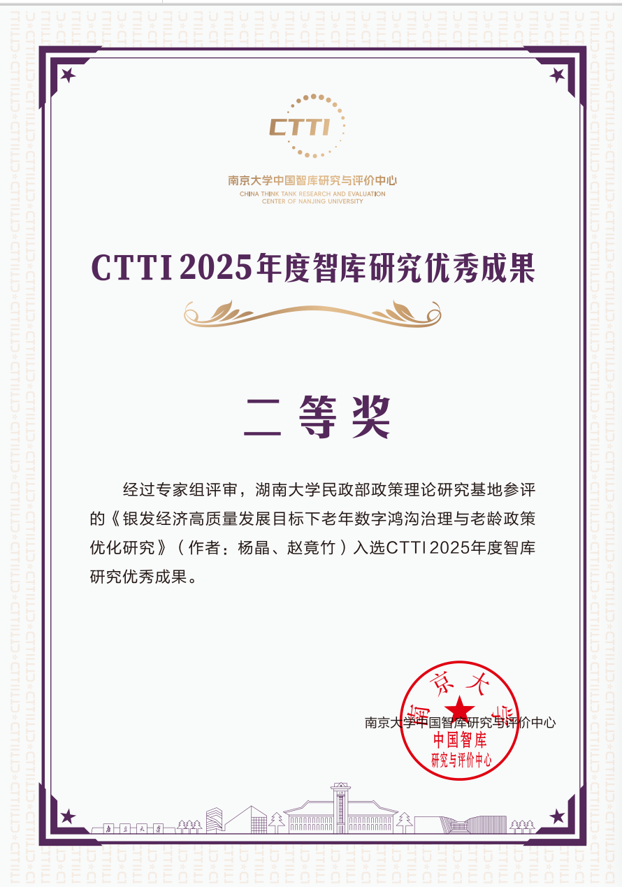 民政部政策理论研究基地”提交的二项成果,获评“CTTI2025年度智库研究优秀成果”二等奖。