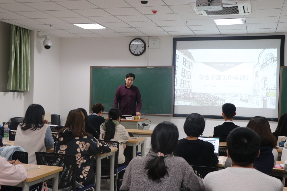 开班致辞后,王老师讲授了学生干部工作能力实训——“创新思维与方案策划”实训课。通过解释“学生干部”这一名称的含义,王老师指出学生干部是以学生身份协助学校进行管理工作。结合王老师列举出的近年全国大学中发生的有关学生干部的事件,同学们充分了解到学生干部的范围与职责,也摆正了对学生干部的态度与看法。