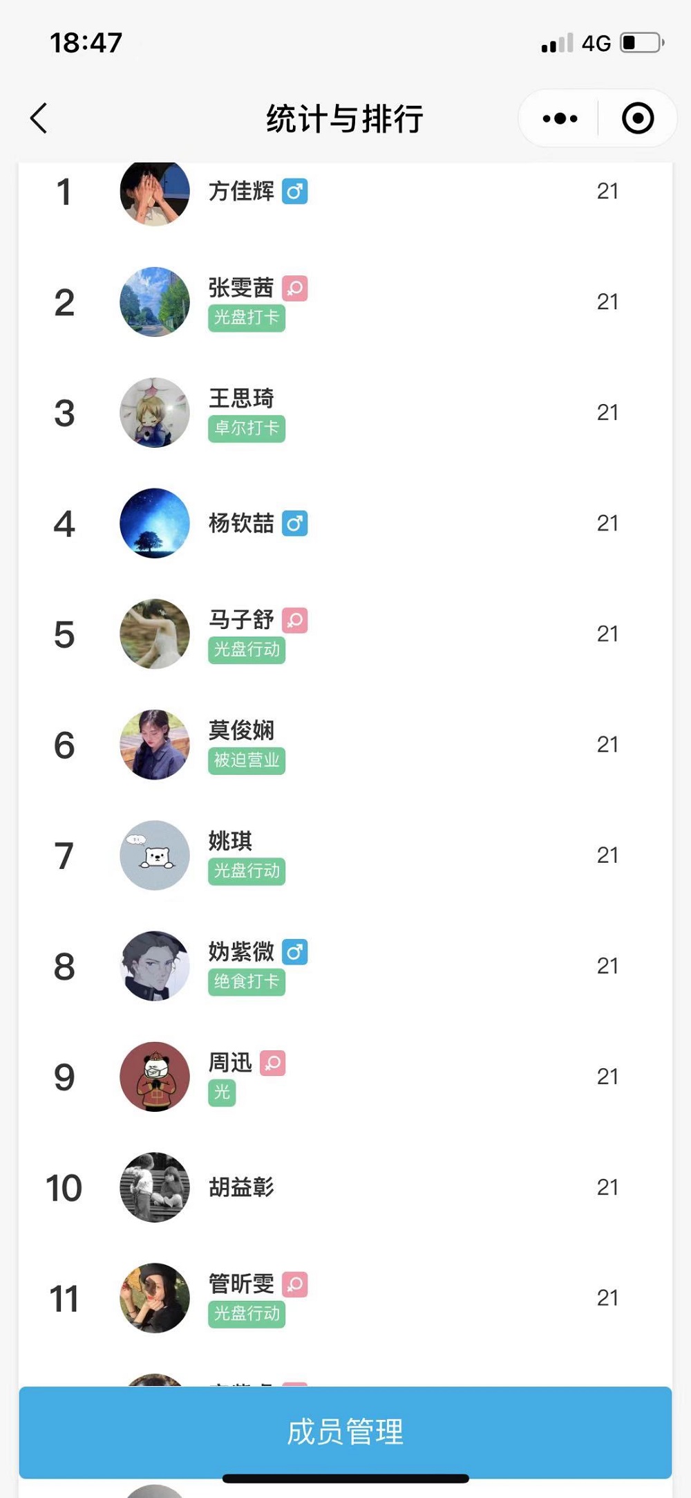 班会伊始,同学们观看了视频——“一粒米到达餐桌需要多少劳动”,了解到全球在零售和消费环节每年约有13亿吨粮食被损耗浪费,这一浪费量相当于14亿中国人约两年的食物消耗量。针对这样的浪费现象,方佳辉同学号召同学们养成节约粮食的好习惯,倡议同学们进行光盘打卡活动,并对坚持在21天的光盘打卡活动中习惯良好的同学进行表扬。