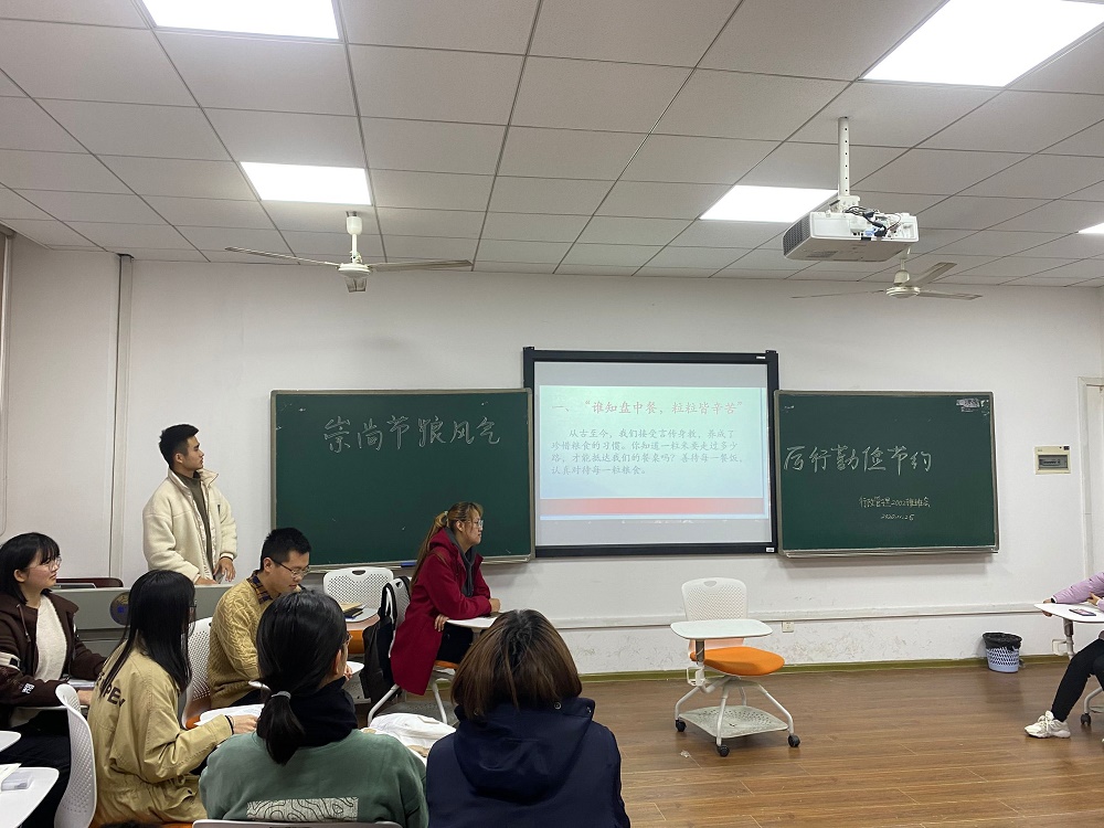 行政管理2002班于11月26日在综合楼308教室开展了以“崇尚节粮风气,厉行勤俭节约”为主题的班会。本次班会由班长方佳辉主持,行管2002班全体同学参加。
