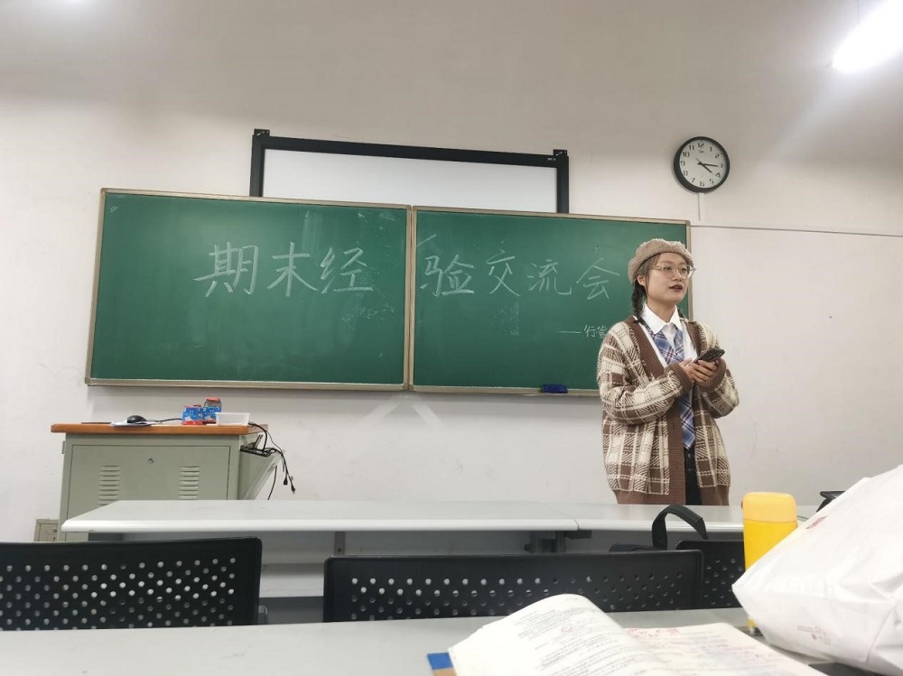 新的学期即将进入尾声,为更好的迎接期末,加强班级学风建设、提升班级同学成绩,本次期末经验交流会特别邀请到了胡鑫雅、颜亚丽和石一琨三位优秀的学长学姐,学长学姐们从课程难度、考前准备、考试内容、答题技巧等,分享全面细致的实用备考经验,引导同学们提高复习的效率和质量。首先胡鑫雅学姐向同学们介绍了各科复习方法,以及开卷、闭卷该如何备考。随后颜亚丽学长为同学们整理并分享了一些相关复习资料,同时介绍了自己背书和答题的方法。最后石一琨学长分享了备考方法,并以自身经验告诫同学们答题时要有侧重点,学会把握好答题时间。