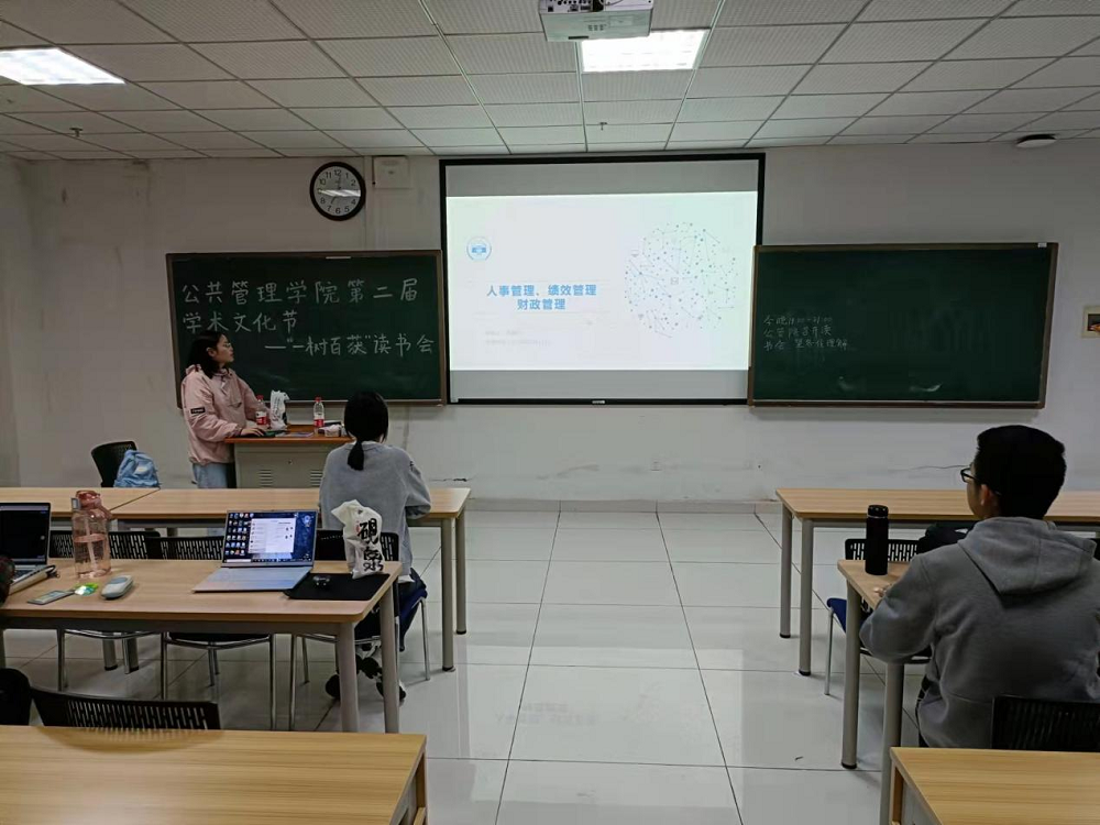 学术文化艺术节系列活动之“一树百获”读书会。本次读书会由21级本科生杨斐然主持,21级研究生王丽妮、谢维维主讲,行政管理21级全体本科生参加。