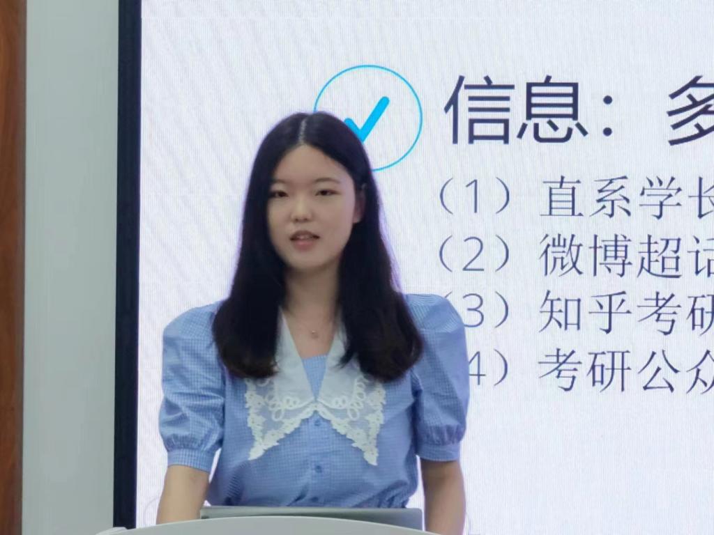 首先,考研至中山大学的刘宇欣同学提出要认识自己、做好决定,同学们应该清晰地认识自我,明白考研对于自己的意义,并提出了三个问题,启发大家思考:为什么要考研?为什么是我?考到哪里去?