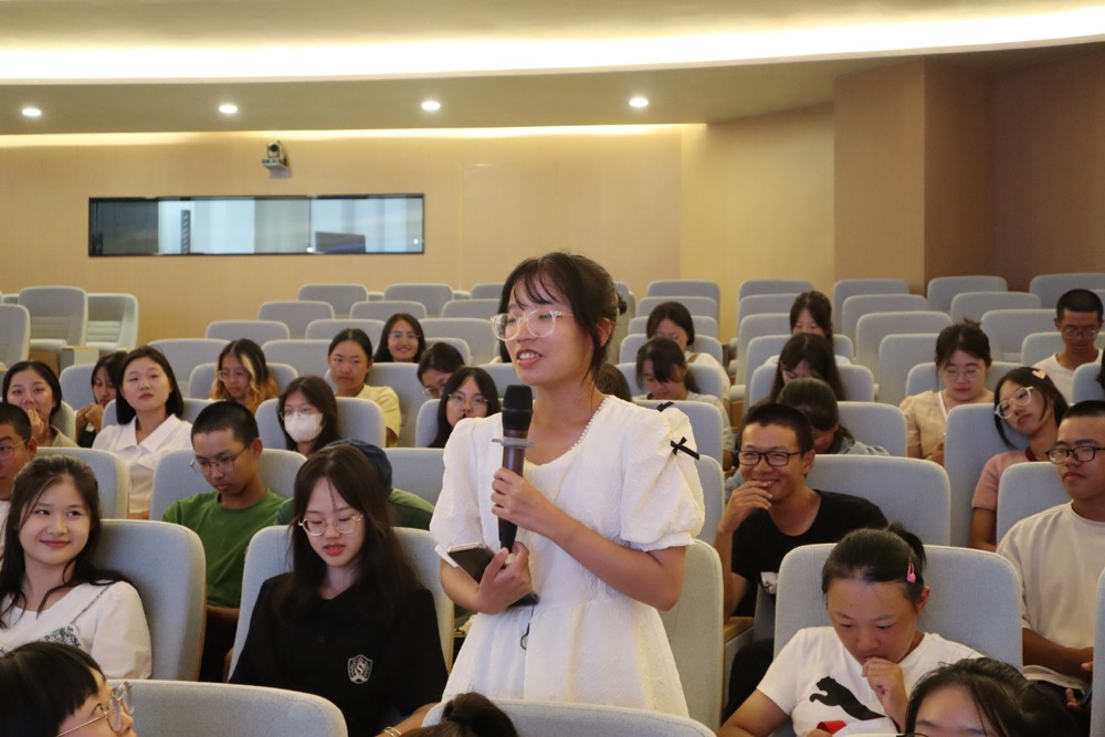 告别会伊始,迎新团队成员从自身经历、选择迎新的缘由、与新生相处的点点滴滴等角度说起,依次抒发了自己这段时间以来的感想,并对新生们寄予殷殷嘱咐与期望。说到动情之处,迎新团队成员们真情流露,流下了不舍与感动的眼泪。回首迎新生活,有的班导分享道,其实自己也没有去过医院,但身为班导必须要勇敢担负起责任,在帮助新生的时候自己也在获得历练与成长。有的班导坦白道,其实刚开始觉得很烦很累,感觉自己坚持不下去,但一路走来与大家亲密相处、彼此相互关照,还是很感激这段相遇的旅程。迎新团队发表完毕告别感言,新生们也主动分享心路历程和对迎新团队的感谢之情,回顾在军训过程中的成长和收获,真挚的分享让在场的每个人都感受到了深刻的情感共鸣。