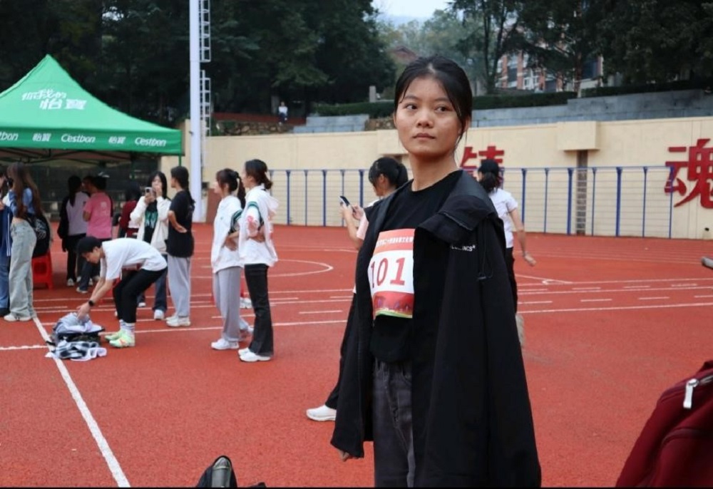 李雅静同学在100米项目的跑道上奋力奔跑,尽力向终点冲刺;符代莲同学则代表无码动画