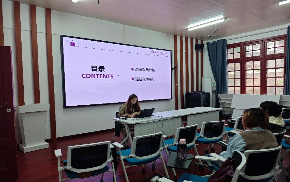 随后,学院研究生会发展服务部部长韩慧敏详细解析了2024年湖南省、北京市等地区的选调政策与遴选政策、中央机关遴选政策等内容,并进一步介绍了选调和遴选的具体优势和未来发展前景。韩慧敏鼓励在座同学积极参与选调和遴选考试,结合自身学术背景和职业理想,选择适合自己的职业发展路径。