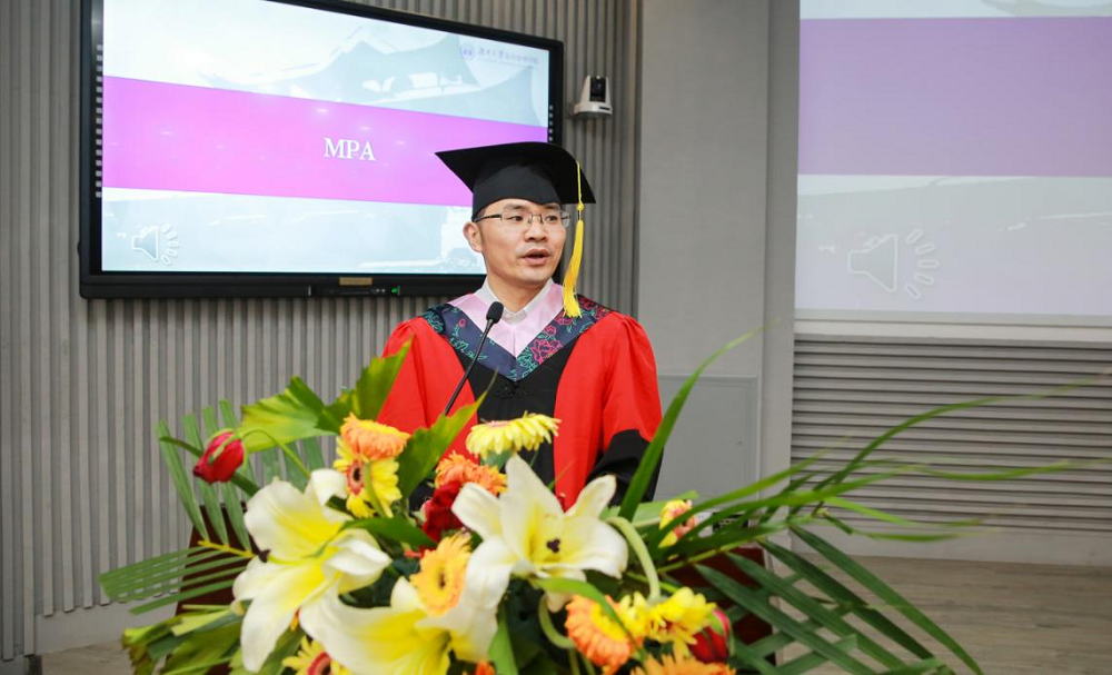 MPA毕业生代表曾臻首先代表MPA全体毕业生向长期以来关心、教育和帮助同学们的各位领导、老师表达了衷心的感谢和崇高的敬意。她说道:“我们将铭记老师的教诲,不忘师长的嘱托,牢记‘实事求是,敢为人先’的校训,将‘博学、睿思、勤勉、致知’变为我们今后身体力行的人生准则。我们会坚持积极向上的信仰和对自由的追求,坚强而乐观地开启全新的旅程。”她的点点回忆,引发在座毕业生的共鸣。