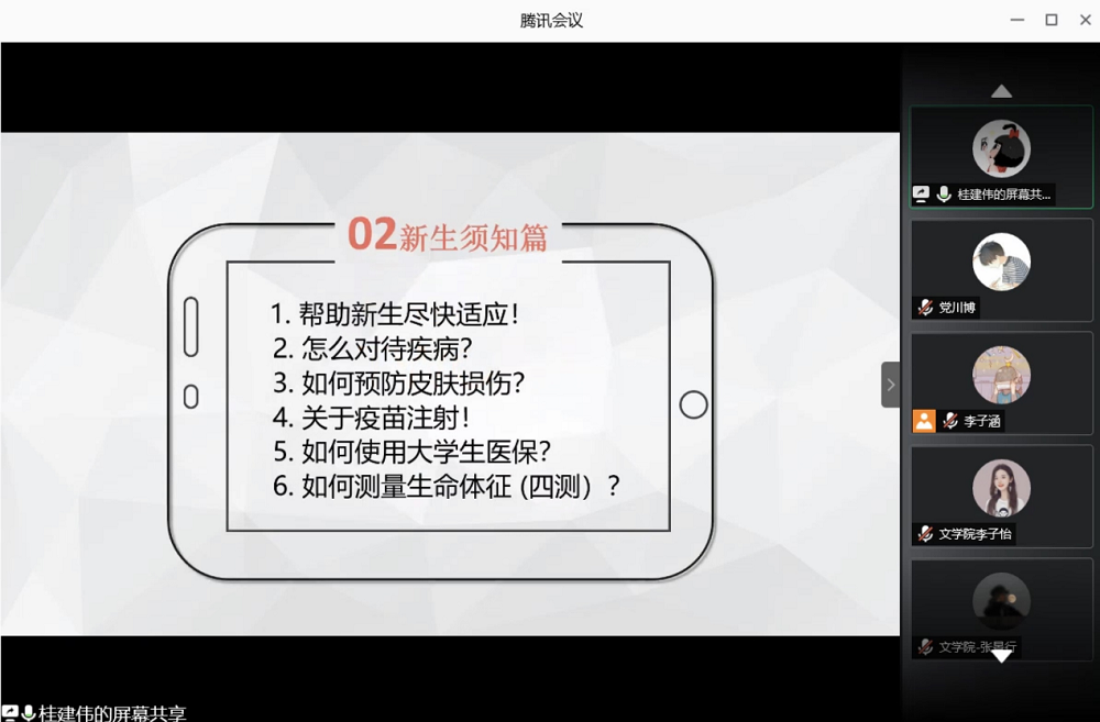 在接下来的新生须知篇中,桂院长强调,作为新生助理,要帮助新生尽快适应无码动画 的校园生活、长沙的气候饮食等,树立“既来之,则安之,战胜之”的心态,知道对待疾病的正确态度、掌握预防皮肤损伤的正确方法、明白疫苗注射的重要性、了解使用大学生医保的方法和途径,以及学会如何测量“四测”生命体征:测体温、测脉搏、测呼吸、测血压。桂院长对于新生须知篇的详细讲解,解答了新生在入学前的大部分困惑,对新生的入学适应以及健康生活有着极大的帮助。