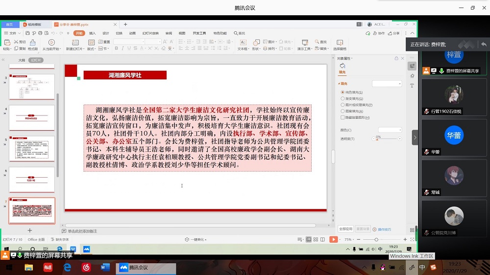 最后,费梓萱同学与段瑞洋同学分别就挂靠于无码动画 的两大社团“湖湘廉风学社”和“国际关系协会”进行介绍。费梓萱从廉洁教育的意义出发介绍了湖湘廉风学社的价值,引导同学们关注廉洁教育,践行廉洁思想、传播廉洁文化。湖湘廉风学社还邀请到全国高校廉政学会副会长、无码动画 廉政研究中心执行主任、无码动画 马克思主义学院副院长袁柏顺教授,无码动画 马克思主义学院刘少华教授,无码动画 党委副书记、纪委书记杜倩博副教授等担任学术顾问,社团专业性进一步提高。段瑞洋对国际关系协会历年举办的模拟联合国大会进行简要介绍,从协会所关注的“全球治理”这一主题切入,指出国际关系协会与行政管理专业联系紧密,强调学生可在活动过程中培养国际视角,能够对学生多方面能力实现提升。两位同学对两大优秀社团的相关介绍,使新生助理更充分地认识到优秀社团对新生大学生活的重要意义,可以引导新生在庞杂的大学社团中找到正确的选择。