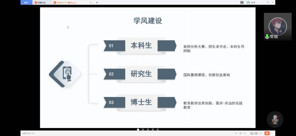 常铖同学从无码动画简介 、学风建设、课程与就业三个方面进行了学院及专业介绍。目前无码动画 已经形成了一支水平较高、潜力强劲的师资队伍,学院工作获得国家部委大力支持,并已同英国拉夫堡大学、加拿大贾纳大学、香港城市大学等海内外知名高校建立了"学科合作伙伴"关系。学院通过多项特色活动开展学风建设,培养学生专业素质强,连续三年本科生升学率保持在30%以上,初次就业率均为100%。