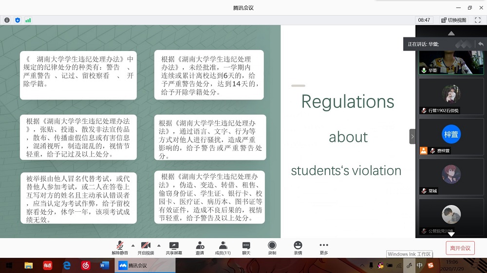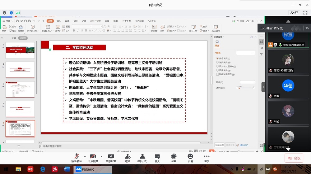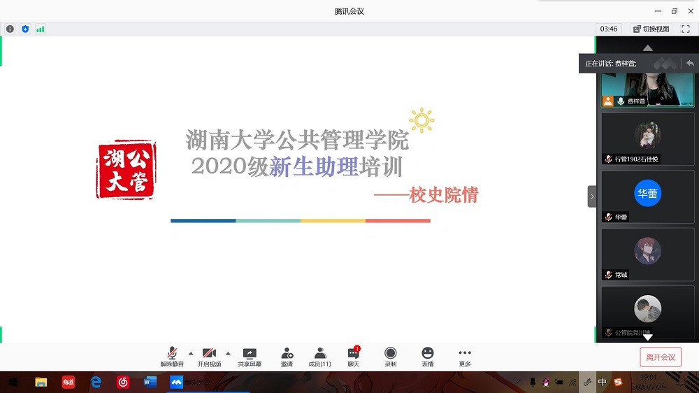 2020年7月29日下午19时,无码动画 迎新团队通过腾讯会议开展了2020级新生助理第二次培训——校史院情培训。本次培训在本科生辅导员闫振振老师的指导下开展,由迎新团队总负责费梓萱同学主持,全体新生助理参与培训。此次培训旨在帮助新生助理了解和掌握学校、学院的各项基本情况,提高迎新期间工作效率与服务质量。