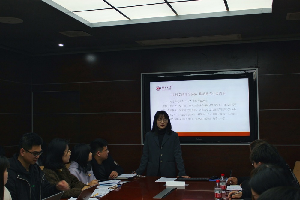 研究生会代表分别介绍了各项工作开展情况。研会主席谢杭介绍了研究生会与团总支总体工作,研会副主席姚艺昊介绍了就业方面工作,研究生第五党支部书记朱振国介绍了研究生党团工作,学术部部长于金源介绍了学术方面工作,宣传部副部长史可欣介绍了宣传方面工作,文体部部长胡斐然介绍了文体方面工作,宣传部部长陈涵介绍了学生权益维护方面工作。