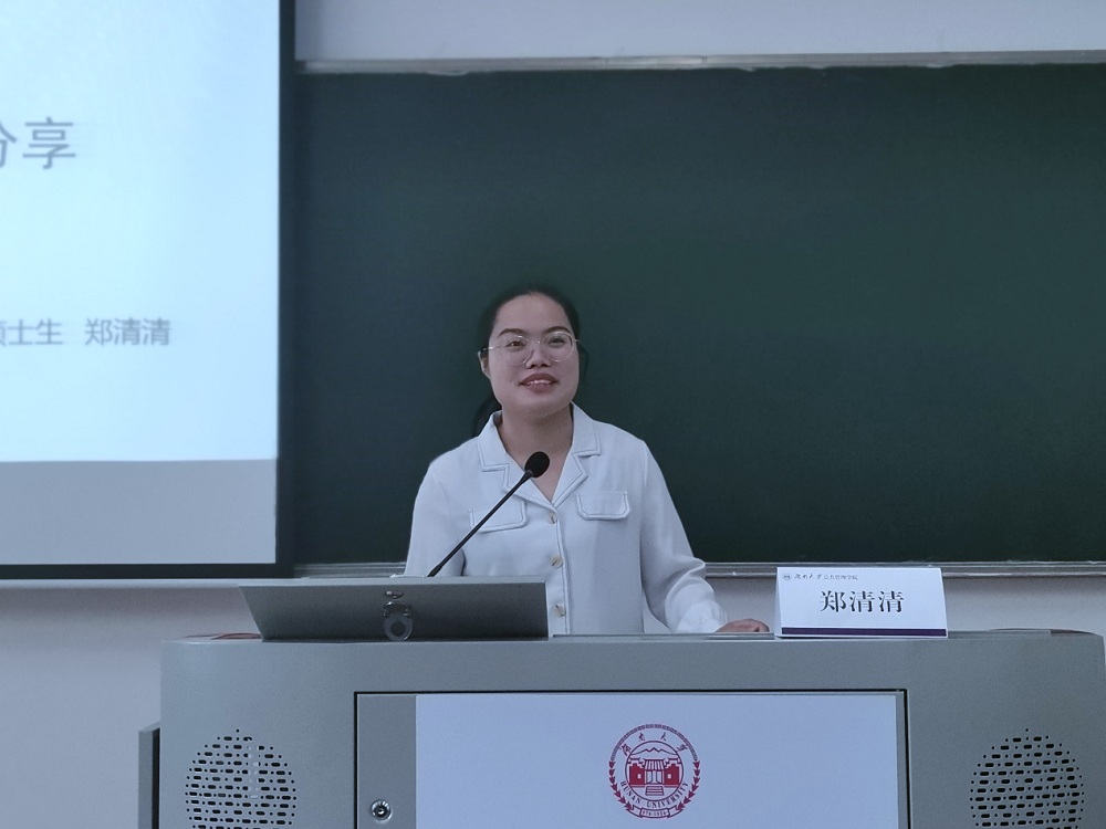 之后,已通过福建省定向选调生选拔的郑清清主要从“考公经验、读研考公的感想”两个方面进行分享。首先,在“考公经验”部分,郑清清从考前资讯收集、备考时间、备考内容等方面分享了相关考公经验。其次,在“读研考公感想”部分,她强调,应“多做真题、勤于总结”、“合理安排答题顺序”、“注重方法”、“珍惜每一次机会,32个省(省、自治区、直辖市)就有32次机会”、“保持良好的心态”。在读研方面,她建议应合理规划时间、多多参加学术活动、广泛阅读、坚持论文写作等。最后,郑清清希望大家“心之所向素履以往”,并对大家寄予了美好的祝愿。