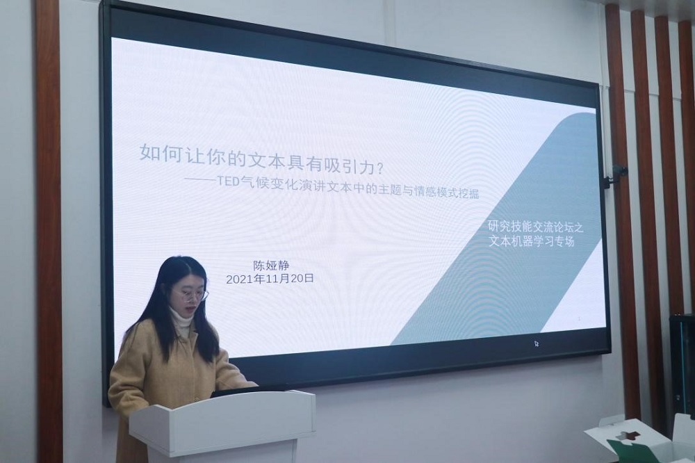 院楼221会议室进行文本机器学习技能交流,两位同学分别以TED气候变化演讲文本中的主题与情感模式和诉诸权威策略对气候变化传播流行性的影响为主题做研讨报告。本次交流研讨会以线下方式进行,由无码动画