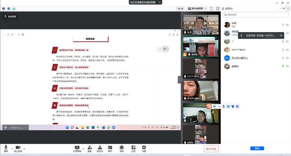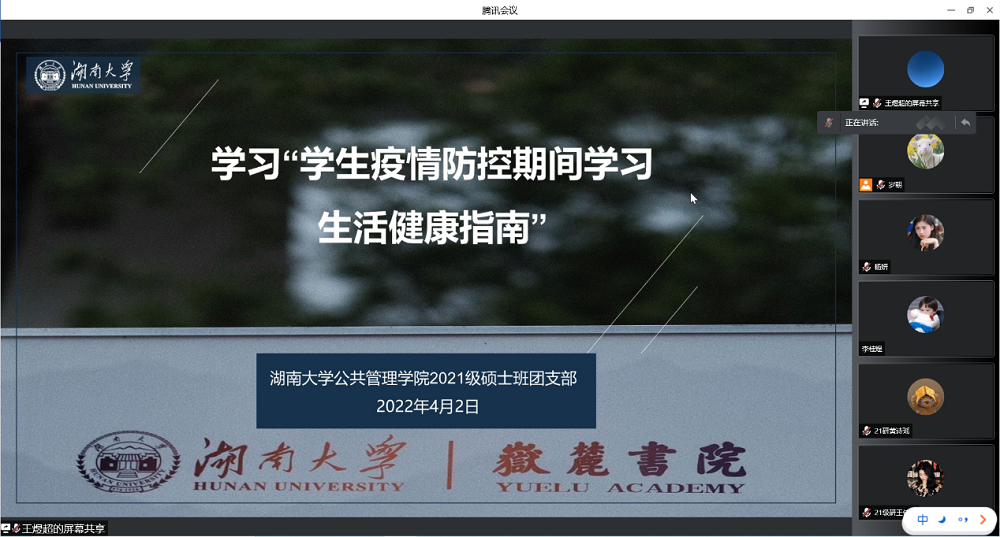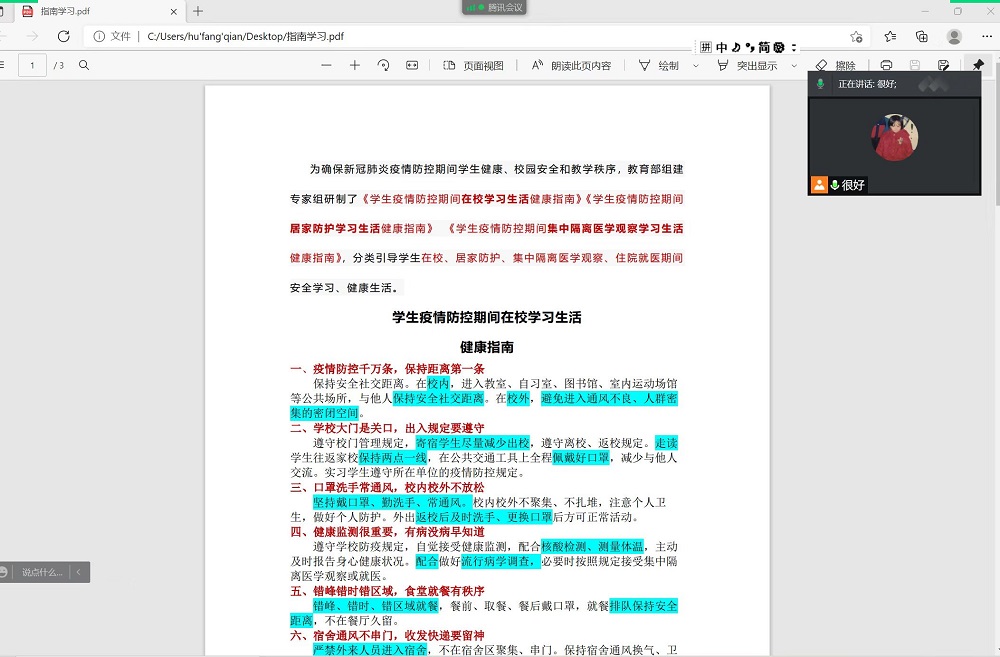 研究生开展《学生疫情防控期间学习生活健康指南》学习活动,各班通过线上形式,在腾讯会议进行学习、交流。
