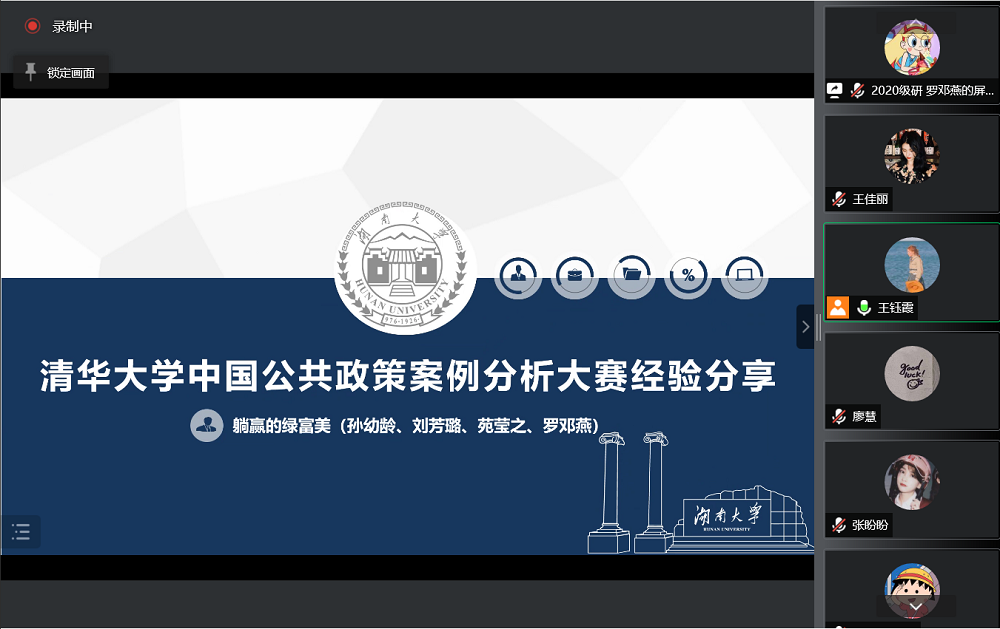 主办,院研究生会承办的清华大学中国公共政策案例分析大赛经验分享通过腾讯会议线上举行,本次活动我们邀请到获得清华大学2021年中国公共政策分析案例大赛三等奖的2020级硕士研究生孙幼龄、刘芳璐、苑莹之、罗邓燕主讲,由2021级硕士研究生王钰霞担任主持人,为同学们的案例写作提供相关经验指导。