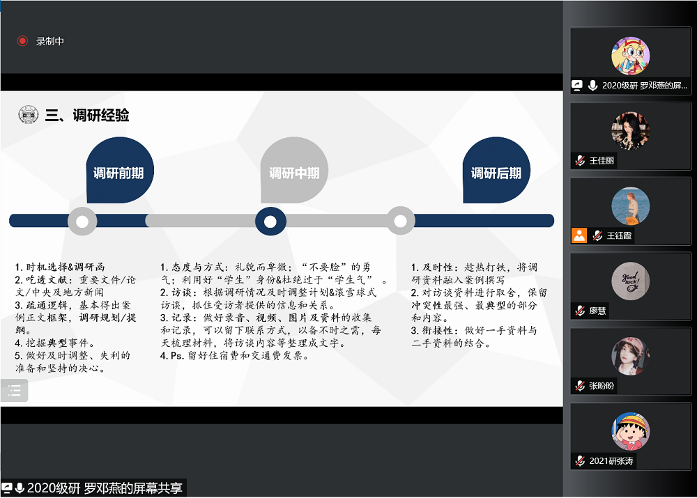 2020级硕士研究生苑莹之结合团队的调研经验与同学们详细分析了调研前期、中期、后期应该注意什么,如调研前要做好及时调整、失利的准备和坚持的决心,调研中要做好录音、视频、图片及资料的收集和记录,调研后要做好取舍,注重及时性、衔接性。
